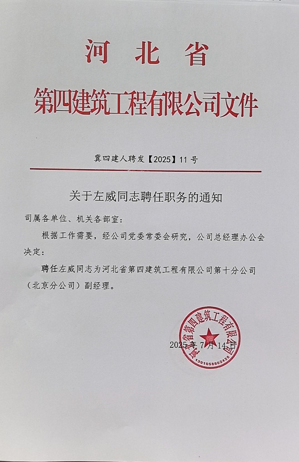 河北四建:关于曹迎新等同志聘任职务的通知